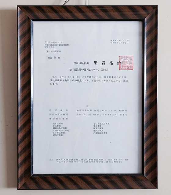| 建設許可番号・神奈川県知事許可 管工事、さく井,水道施設、土木、とび・土工、解体 舗装、塗装、石、鋼構造物、しゅんせつ工事業 |