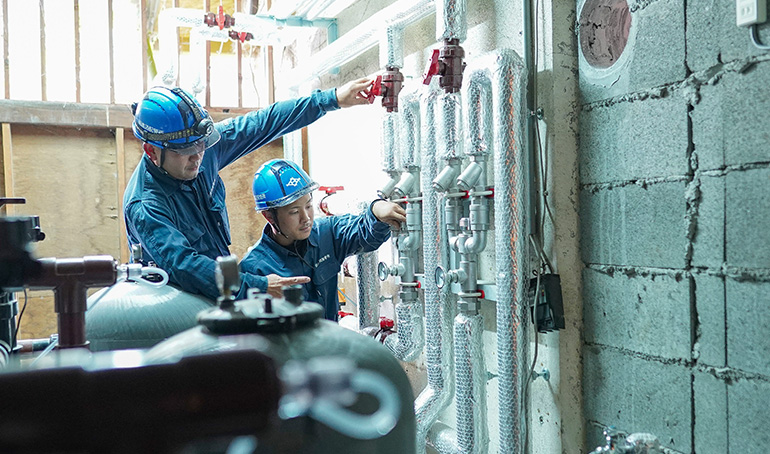 わたしたちのもう一つの大きな業務は、社名にもあるように配管工事です。文字通り水の流れをスムースに機能的にするもので、新設の工事からメンテナンスまでを一貫して対応しています。